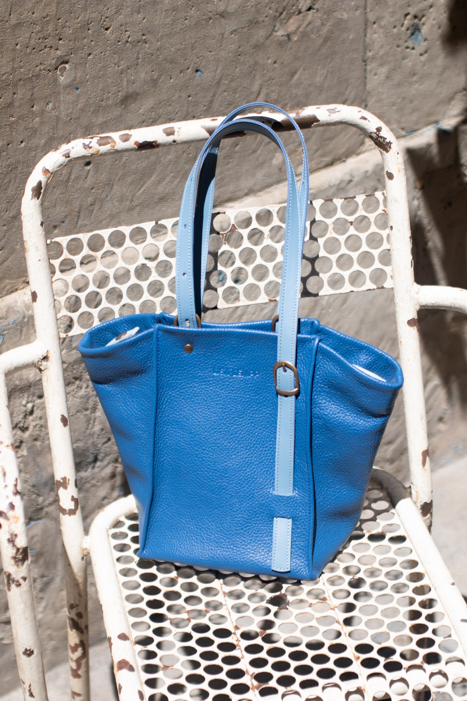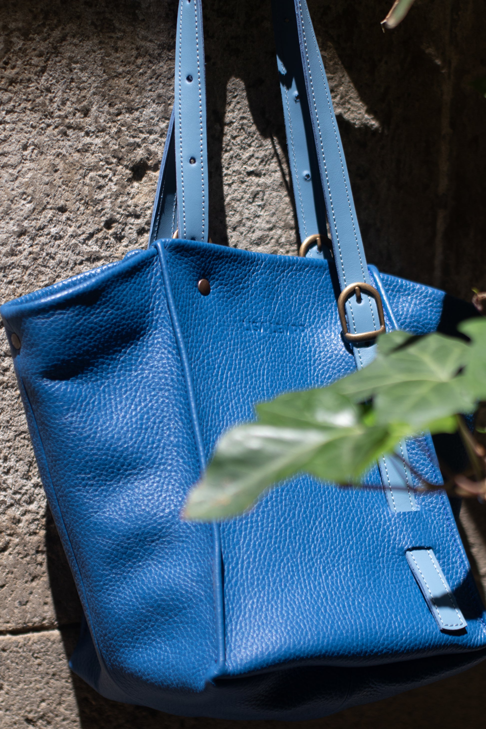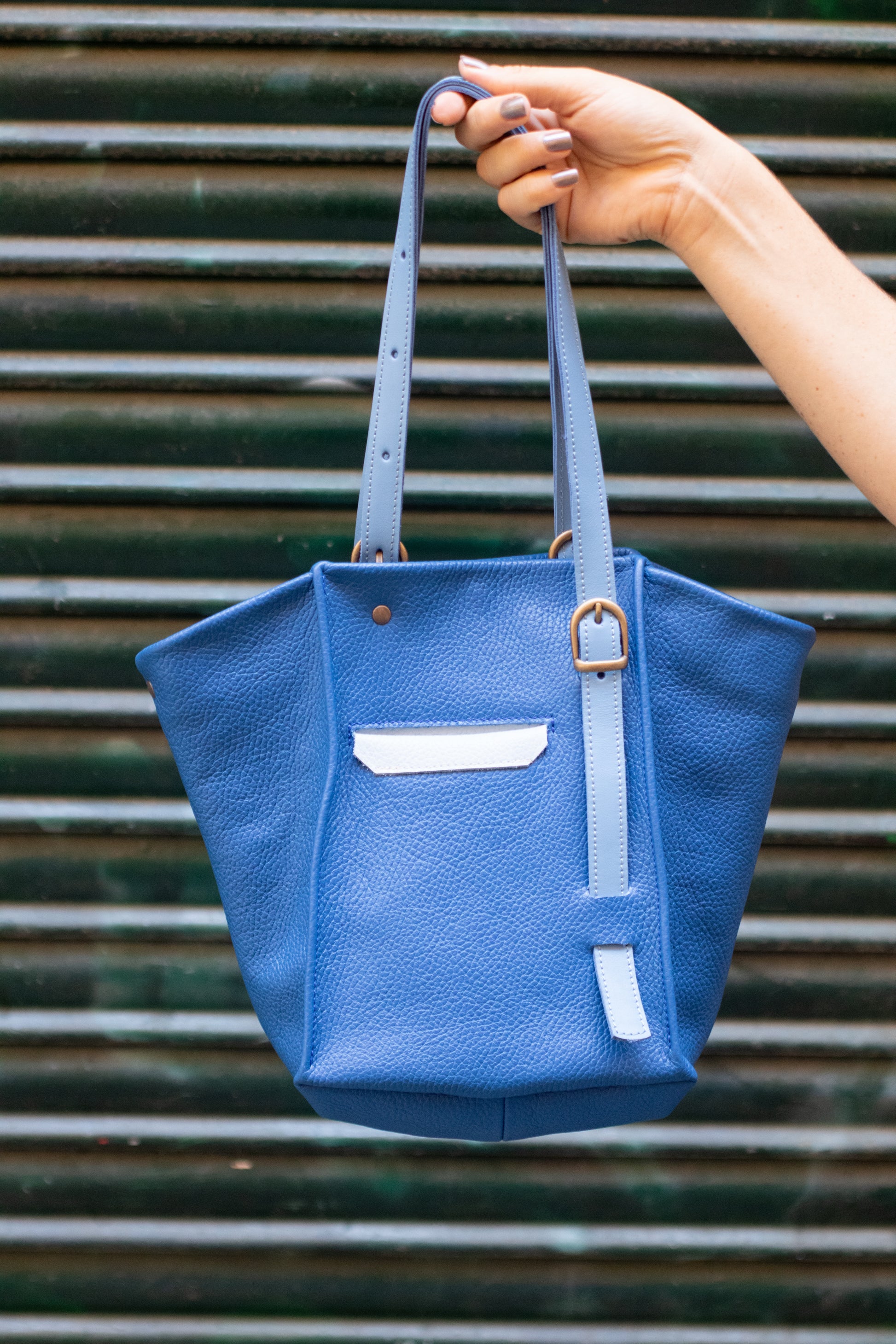 Exterior: Body made of soft Italian cowhide in blue. Handle and front pocket detail in Italian cowhide in light blue.