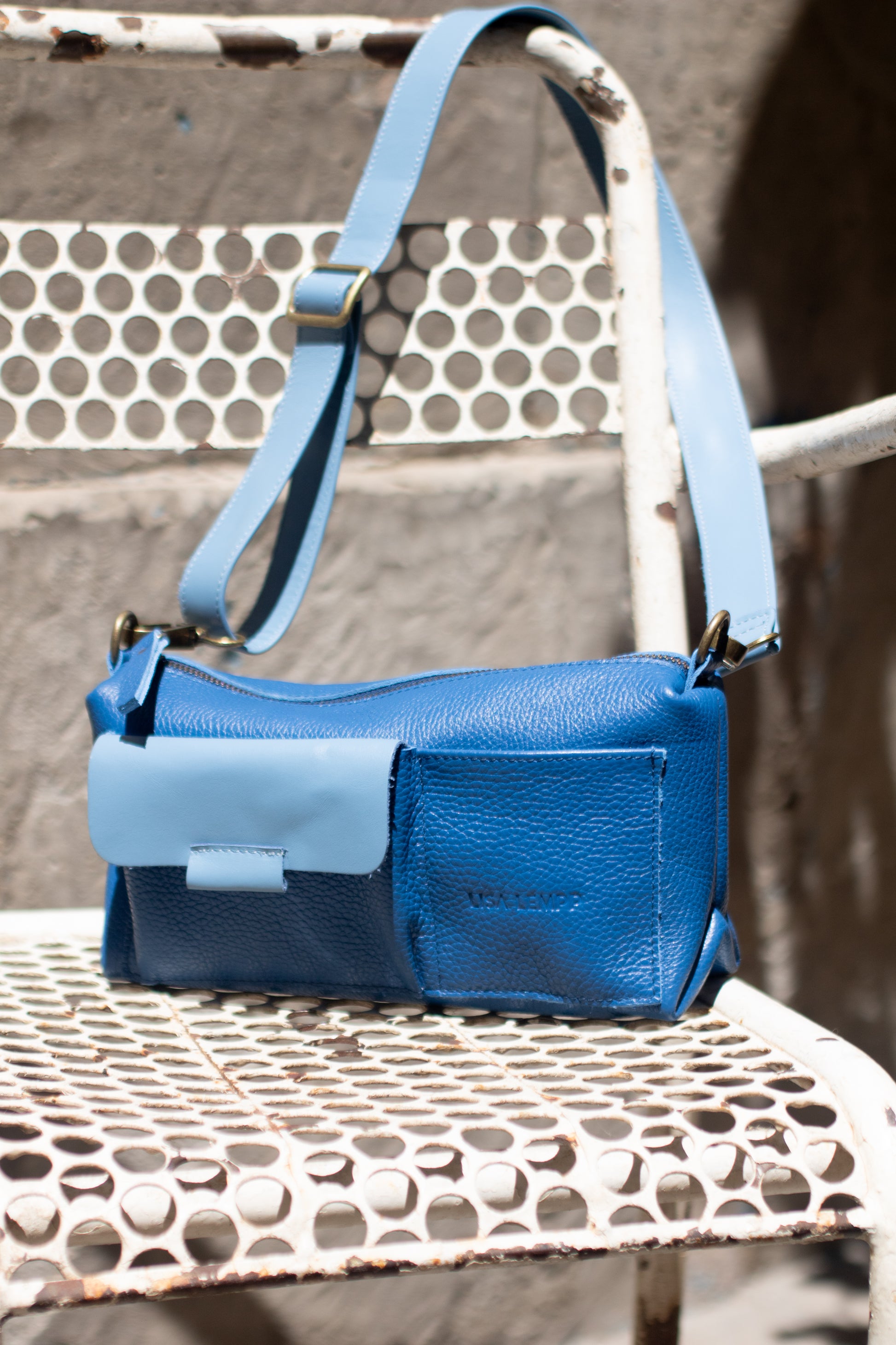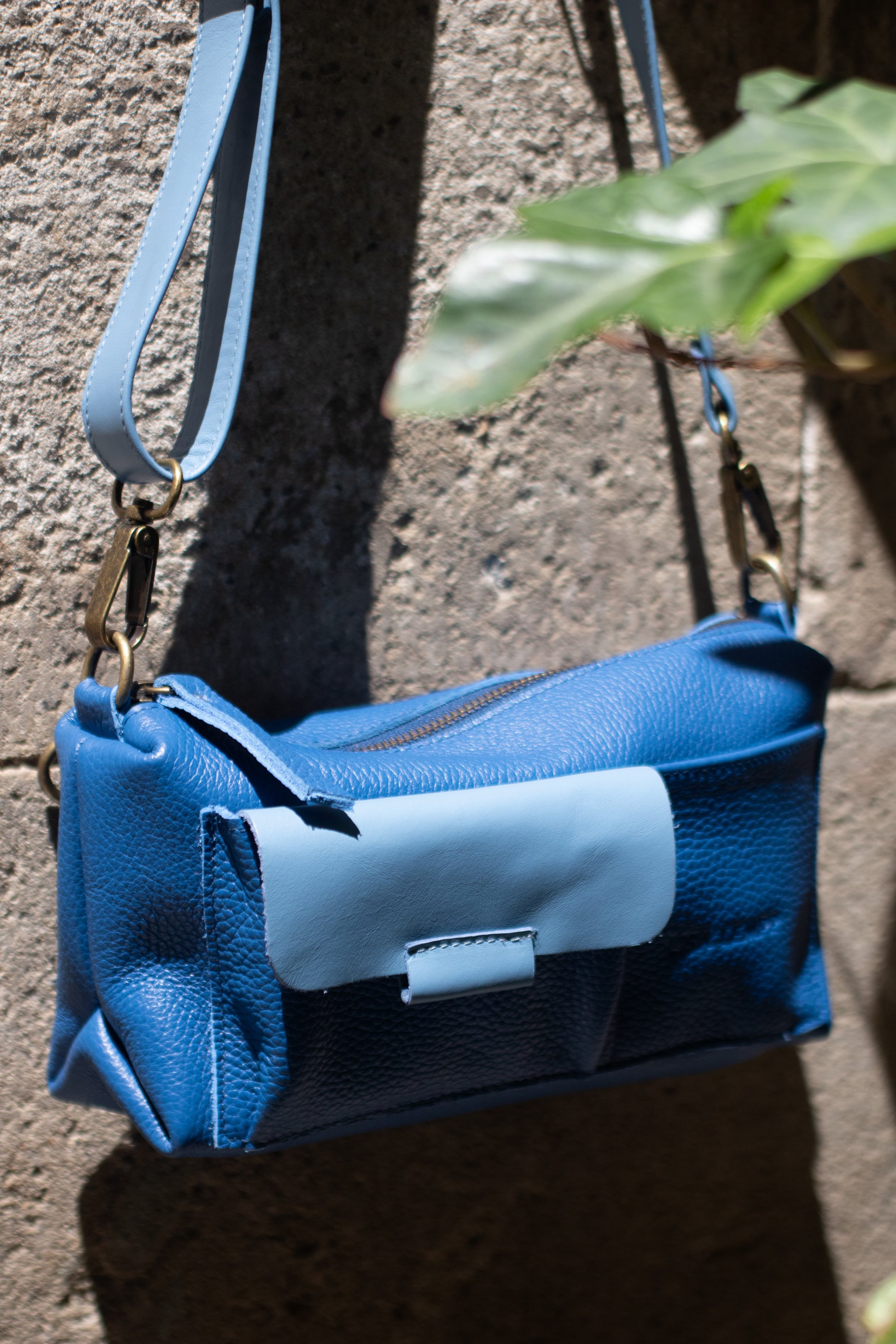 Exterior: Piel Italiana de vacuno en azul. El asa y la solapa de bolsillo en azul claro.