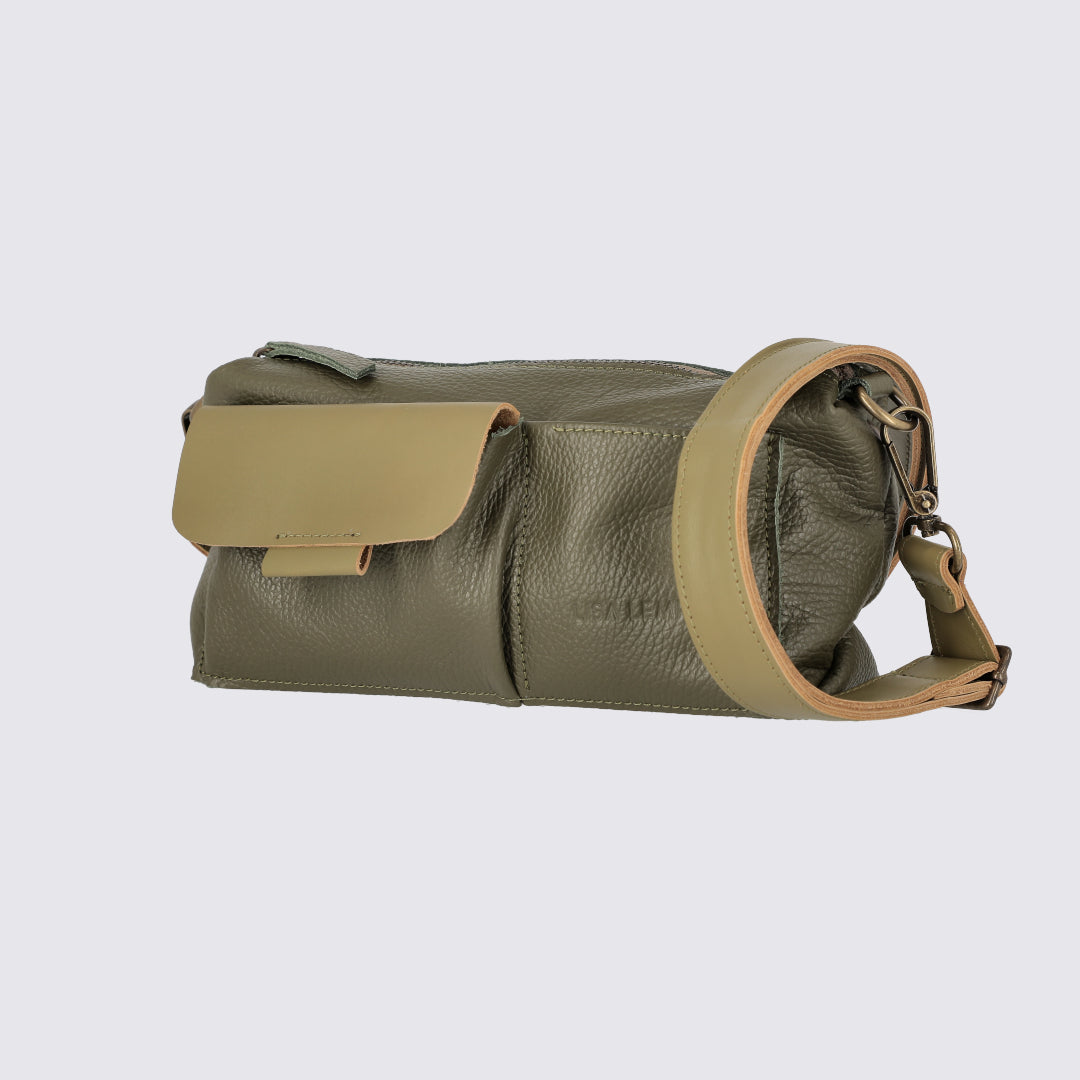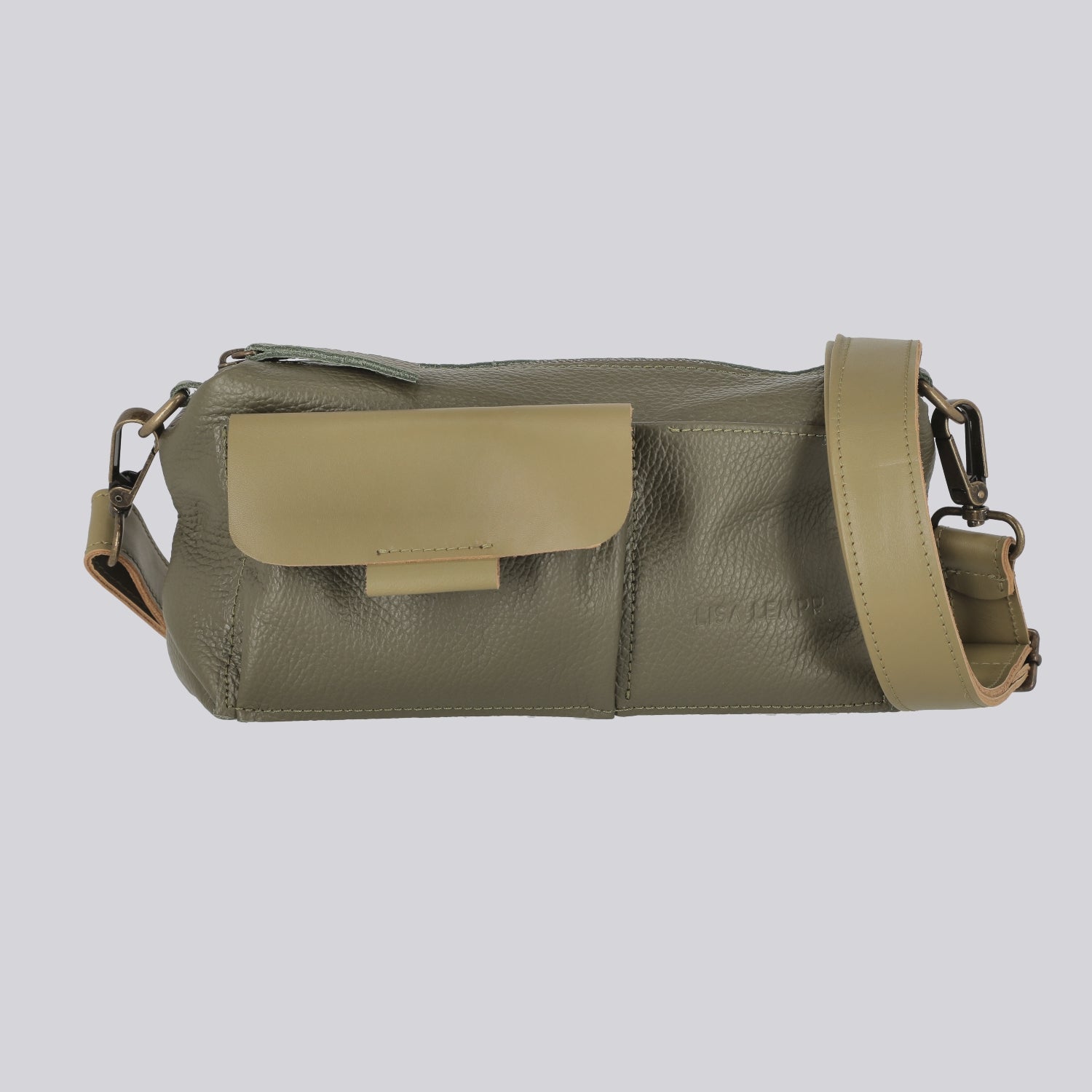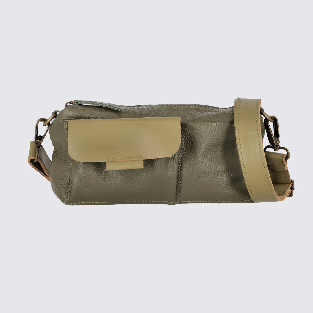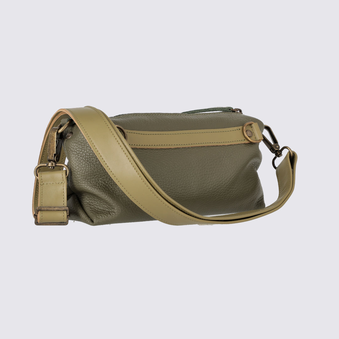 Exterior: Piel Italiana de vacuno en verde oliva. El asa y la solapa de bolsillo en caqui.