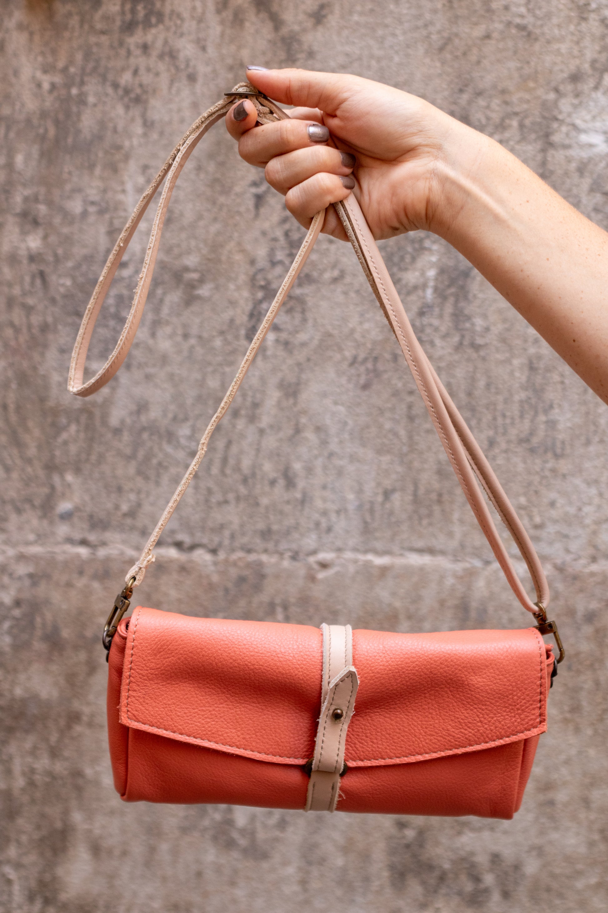 Exterior: Piel Italiana suave en coral con detalles en rosado.
