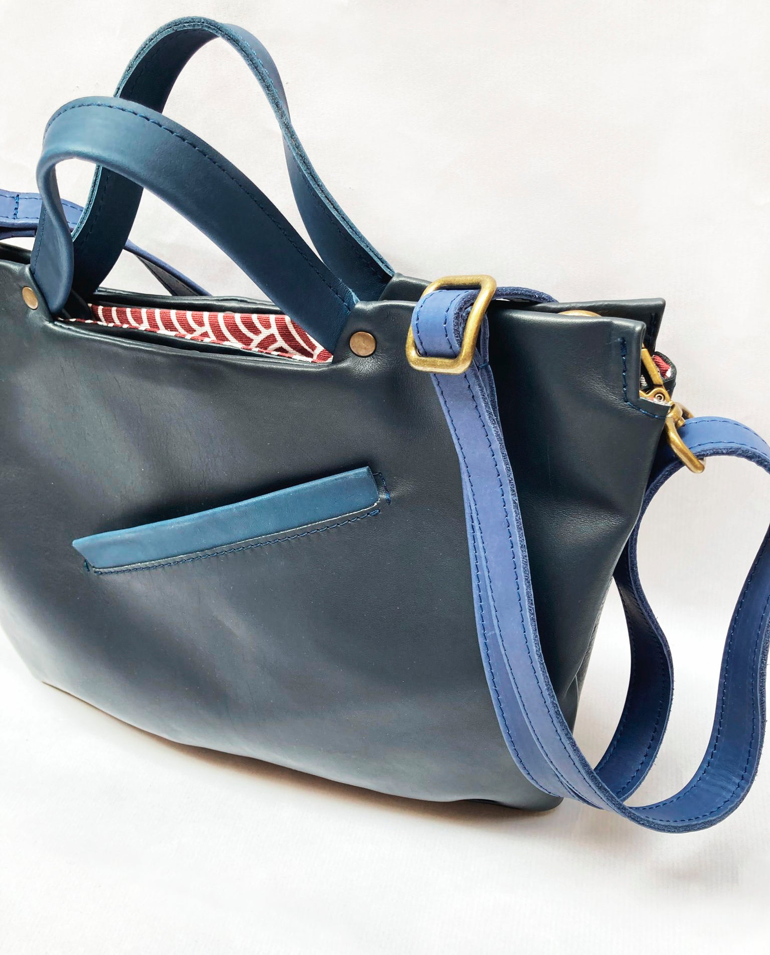 Exterior: Piel Italiana de vacuno ligera y suave con detalles en otro tono azul.. Color navy.