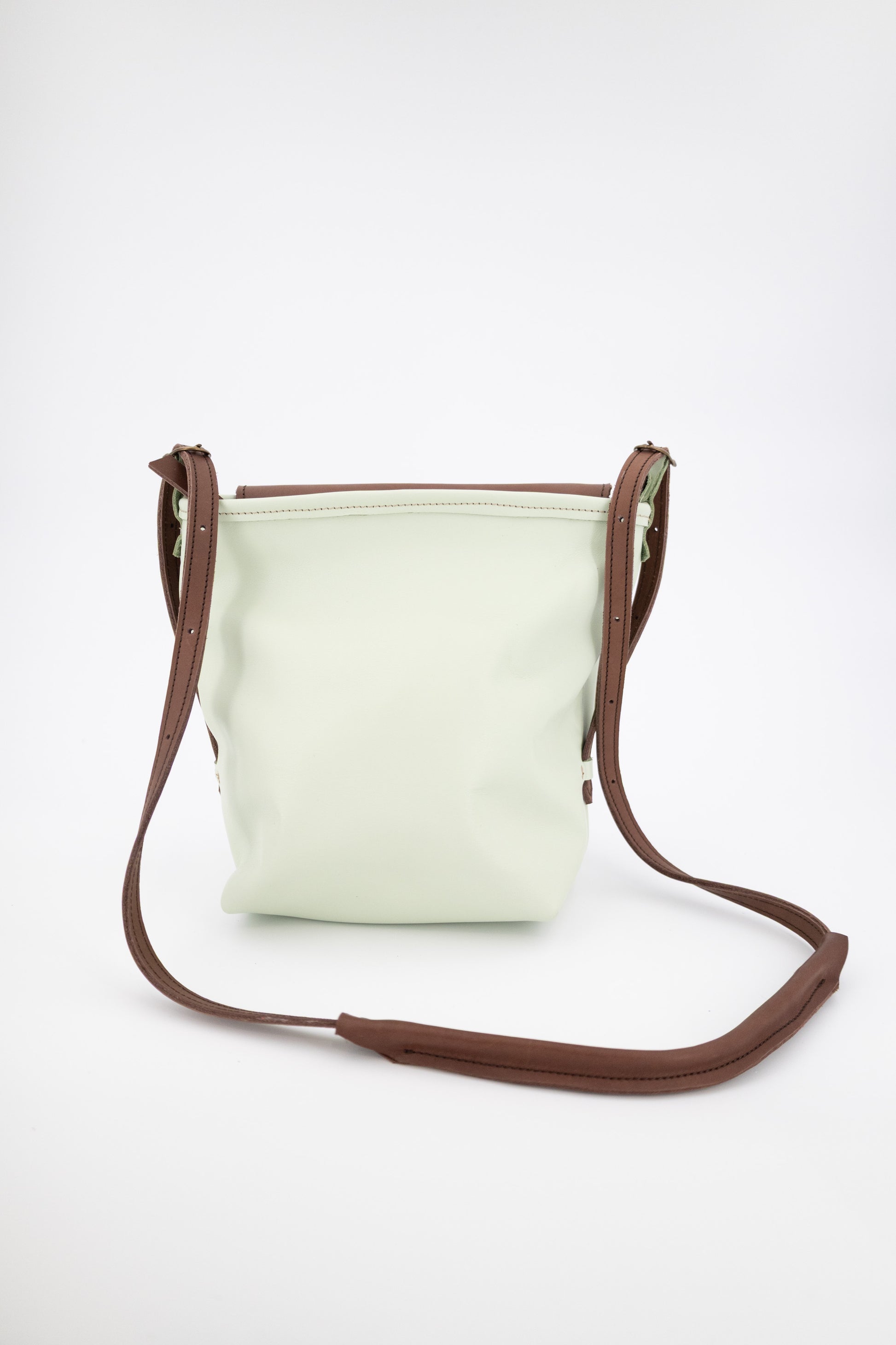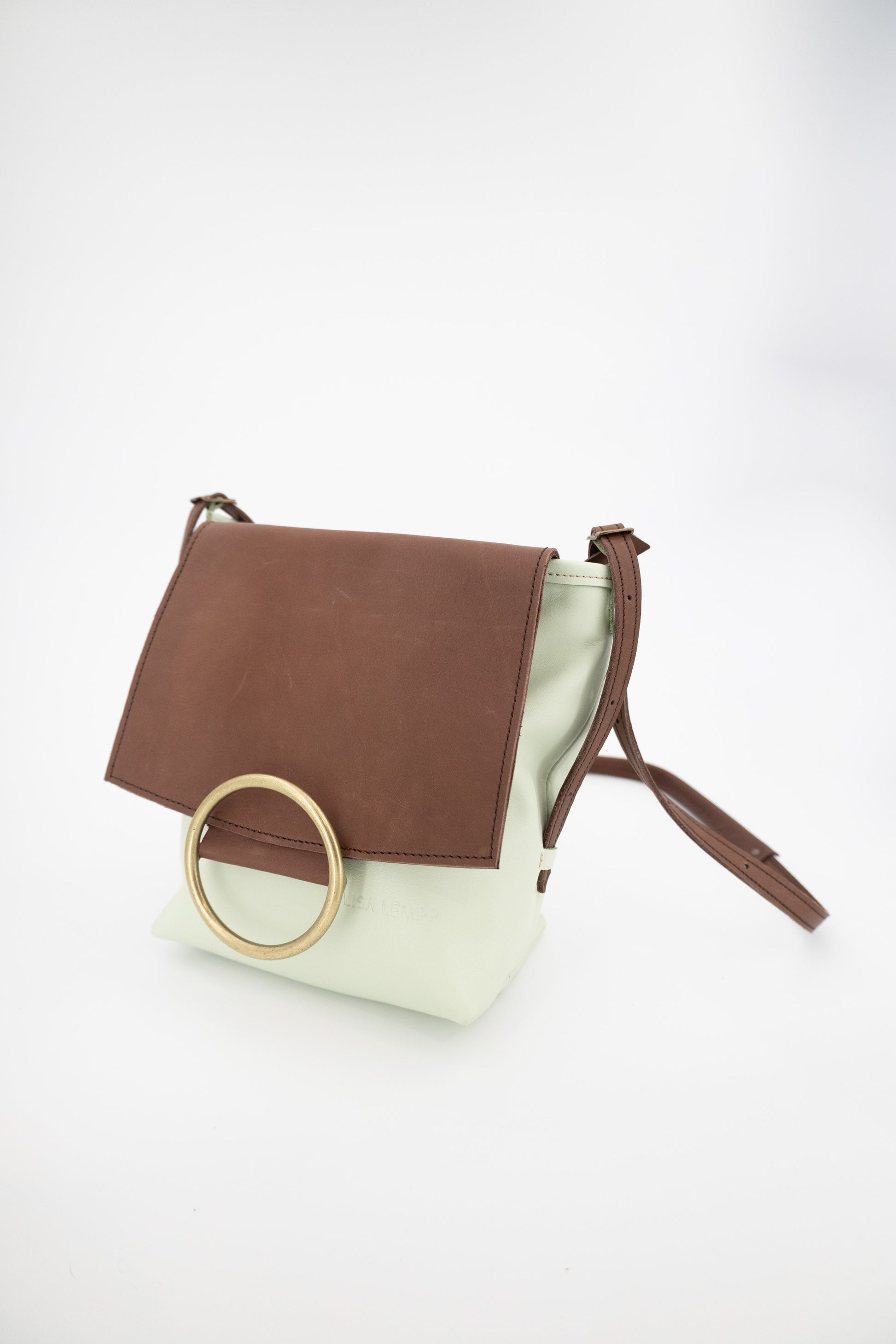 - Piel Italiana de vacuno con un toque de brillo y acabado en cera. Color marrón y verde menta.